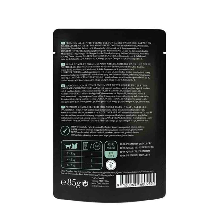 Le bustine freschezza CAT’S LOVE con tacchino sono a base di olio di semi di lino e ortica. Queste bustine di freschezza 100% naturali sono prive di cereali e forniscono un pasto completo per il tuo gatto.