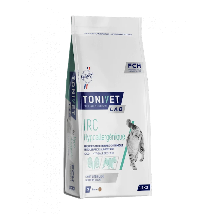 Tonivet IRC hypoallergenic risponde all’insufficienza renale cronica limitando l’apporto in fosforo e riducendo la produzione di tossine uremiche.